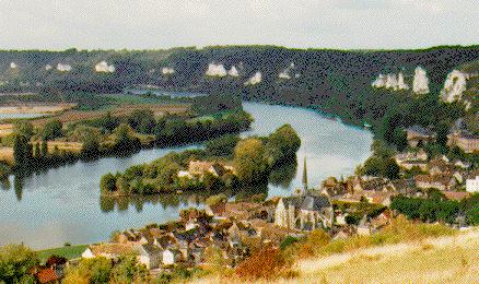 We had breakfast - almond croissants - sitting in front of the tent, and admiring the great view, then packed up and hit the road. We didn't want to go back down the way we'd come up. That had been a narrow road which was being dug up for something - new gas, water, or sewer pipes by the look of it - so we squiggled basically southwards along the ridge at campsite level. We came back out at the top of the wonderful long coast down into Vernon again. We belted down that (yet again - maybe a bit more under control this morning, in case there was a less-laidback policeman there today). We crossed the bridge over the Seine (yet again - stopping this time to take a few pictures), but at the other end of the bridge we turned left, north, this time, rather than south.