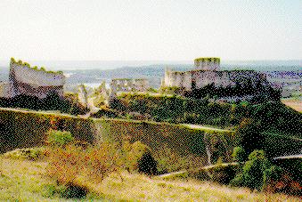 Just before reaching les Andelys, we turned left down an incredibly steep track, to check out the ruins of Château Gaillard, a 12th century castle which was destroyed in the 17th century. We had to park the bikes by the road and scramble up a dirt hill to get to the ruins. Very impressive, but - wouldn't you know - the main keep (remains of) is closed on Wednesday mornings. Still, there was a lot of ruin left to explore, and we spent some time wandering around, and admiring the view of les Andelys in the valley which it commanded. Then it was down to les Andelys for lunch. Les Andelys consists largely of half-timbered houses so we looked around a bit and took some pictures.
