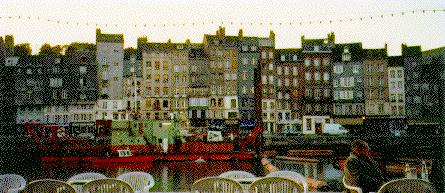 Finally came the drop into Honfleur, where we arrived after dark. On the way in, we could see the new bridge into Le Havre - the Pont de Normandie - lit up in the distance; very dramatic and impressive. The campsite in town was closed for the season, so we took a room in the Hotel de la Tour. They let us put our bikes in a small corridor behind the kitchen - used as a storeroom. Went out to a fancy restaurant (terrine, saumon, fromage - including the local Pont l'Eveque, Poire Charlotte, and an introduction to Pommeau - a local liqueur made by fortifying (hard) cider with Calvados (apple brandy)). After dinner, on to a bar, and then back to the room where we rinsed out our cycling gear.