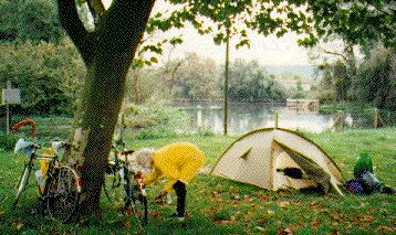 Bikes: Ann rides a Raleigh Randonneur, and Paul rides a Dawes Super Galaxy. Both are reasonably standard, though Paul - being a gadget freak - has replaced the saddle, bars, and rear rack. We've got Blackburn style back racks and front low riders. We each carried back and front panniers and a camera bar bag. Sleeping bags, cooking equipment etc, as well as our clothes fitted in the panniers. Paul carried the tent and Ann carried the sleeping mats on the back rack.